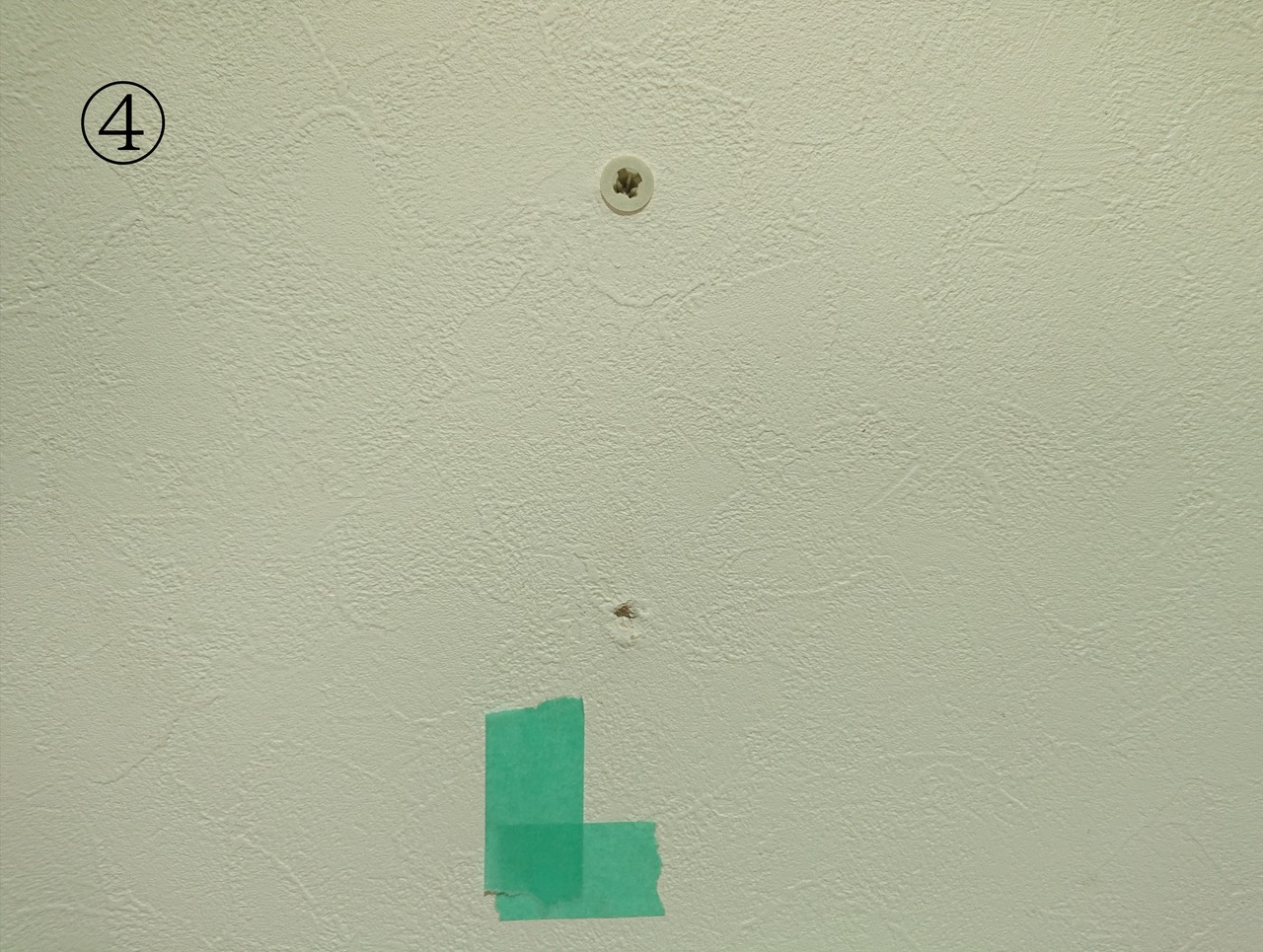 ②、①で付けたしるしに合わせてビスを1回転位させて戻します。ビスに白い粉が付けば石膏ボードになります。石膏ボードの場合は4箇所のビスを付ける穴にビスを1回転程度回し壁にしるしをつけます。(この時に棚がずれない様にします。)