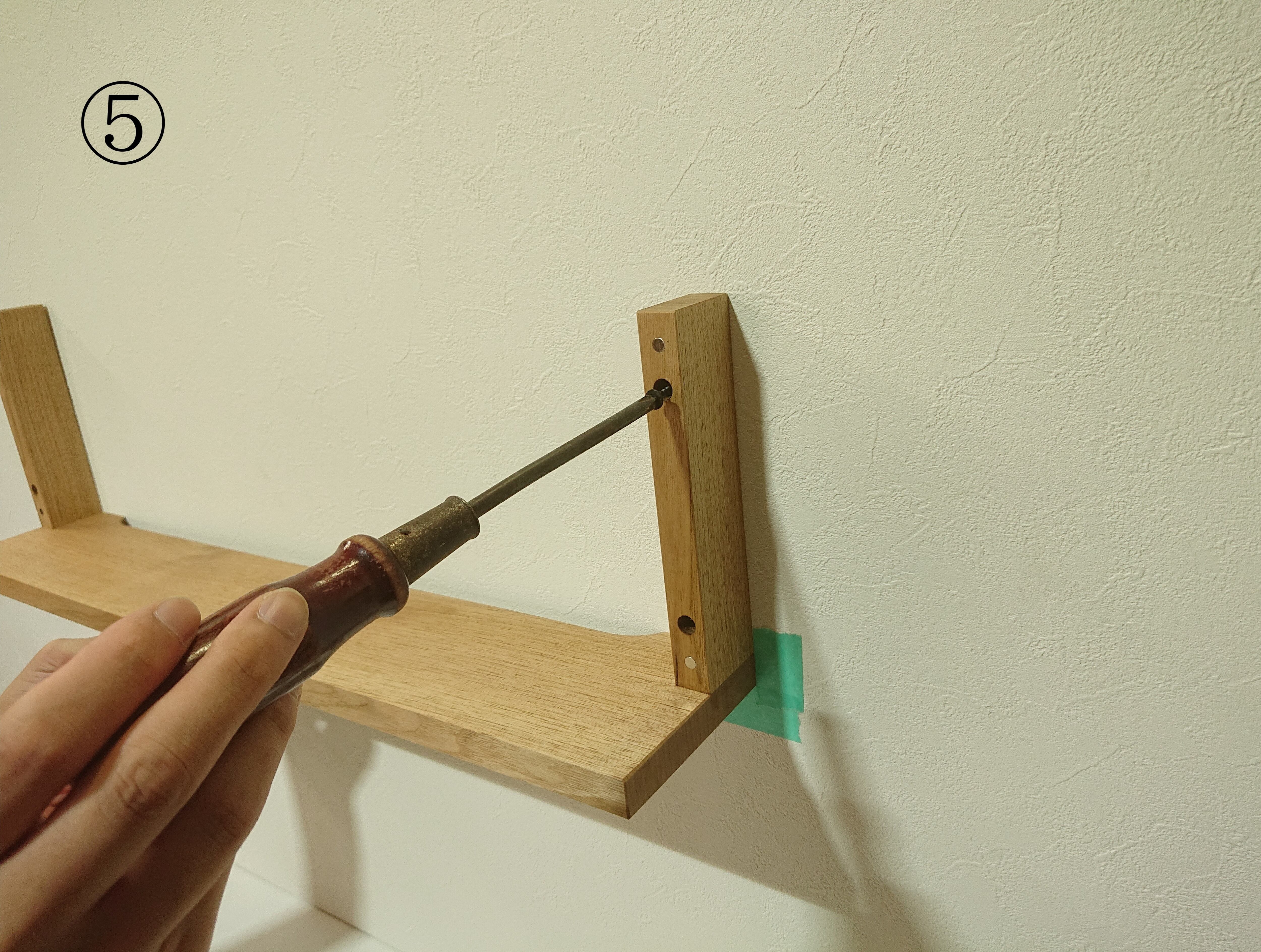 ⑤ボードアンカーを取り付けたら①でつけたしるしに棚を合わせてビスを取り付ければ取り付け完了です。(ビスを取り付ける際は4箇所ビスを1,2回転させて仮止めをしたあとに本締めします。ビスを回してから緩む方向に回されますとボードアンカーまで回る場合がありますので一度締めたら逆回転させずに取り付けてください。)