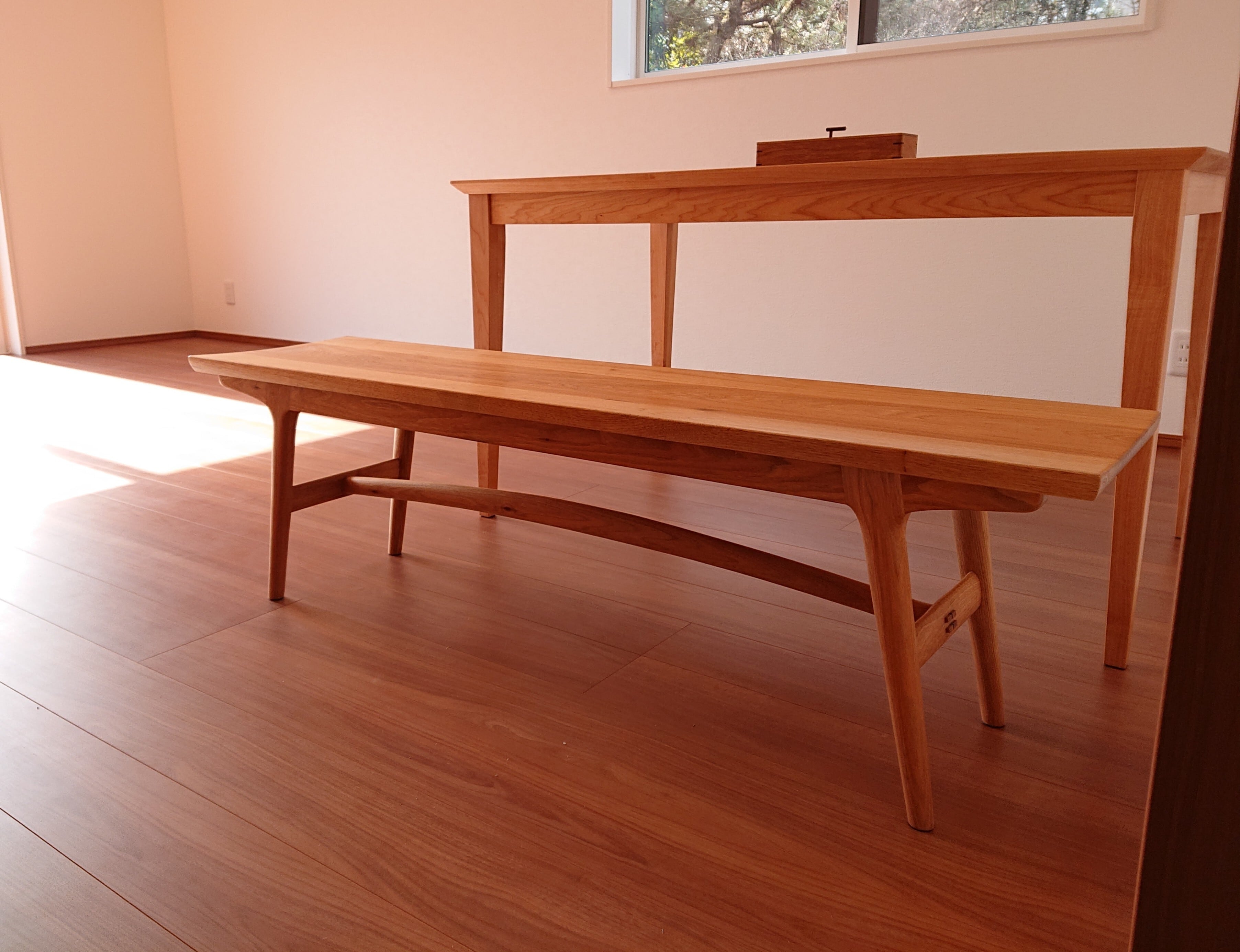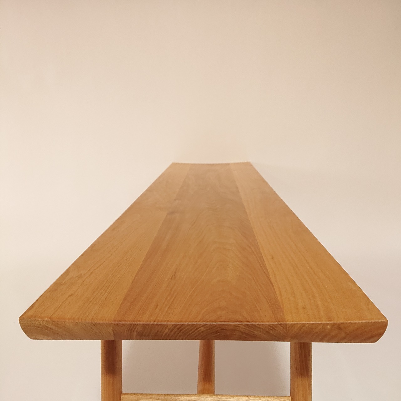 ベンチ、座面が座った時にピッタリくるよう彫り込んであります。